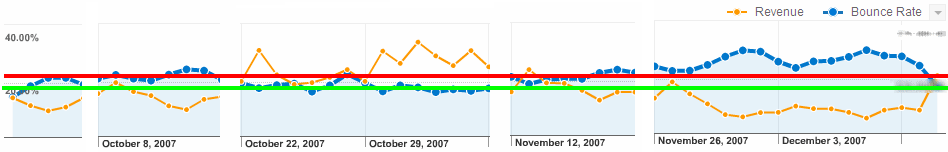 Concevoir une page d’accueil ergonomique →Je suis allé tester les nouvelles fonctionnalités de Google Analytics dès leur mise en ligne la semaine dernière et elles m’ont permis de faire une première découverte. Le taux de rebond, à un certain niveau, a une influence significative sur le revenu. En effet, j’ai pris deux sites parmi nos clients en commerce électronique et j’ai comparé ces deux métriques entre septembre et décembre.