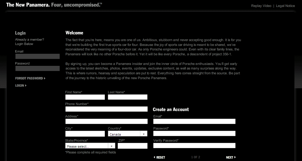 Il y a de forte chances que vos visiteurs aient aussi les mêmes préoccupations. Soumettre de l’information sur un site comporte deux aspects décourageants pour le visiteur : (1) le risque que la valeur promise ne compense pas l’effort fait pour trouver, lire et saisir les données (2) le risque de voir ses informations être propagées ou son consentement utilisé à mauvais escient. Or, plusieurs sites oublient complètement ces deux désagrément majeurs quand ils demandent aux utilisateurs d’accepter des conditions ou de remplir un formulaire. Veut-on vraiment créer un compte en remplissant 2 pages de 10 champs chacune, pour s’abonner à l’infolettre de la Porsche Panamera (même si nombre de sites de photos espions d’automobiles nous l’avaient déjà montrée)?