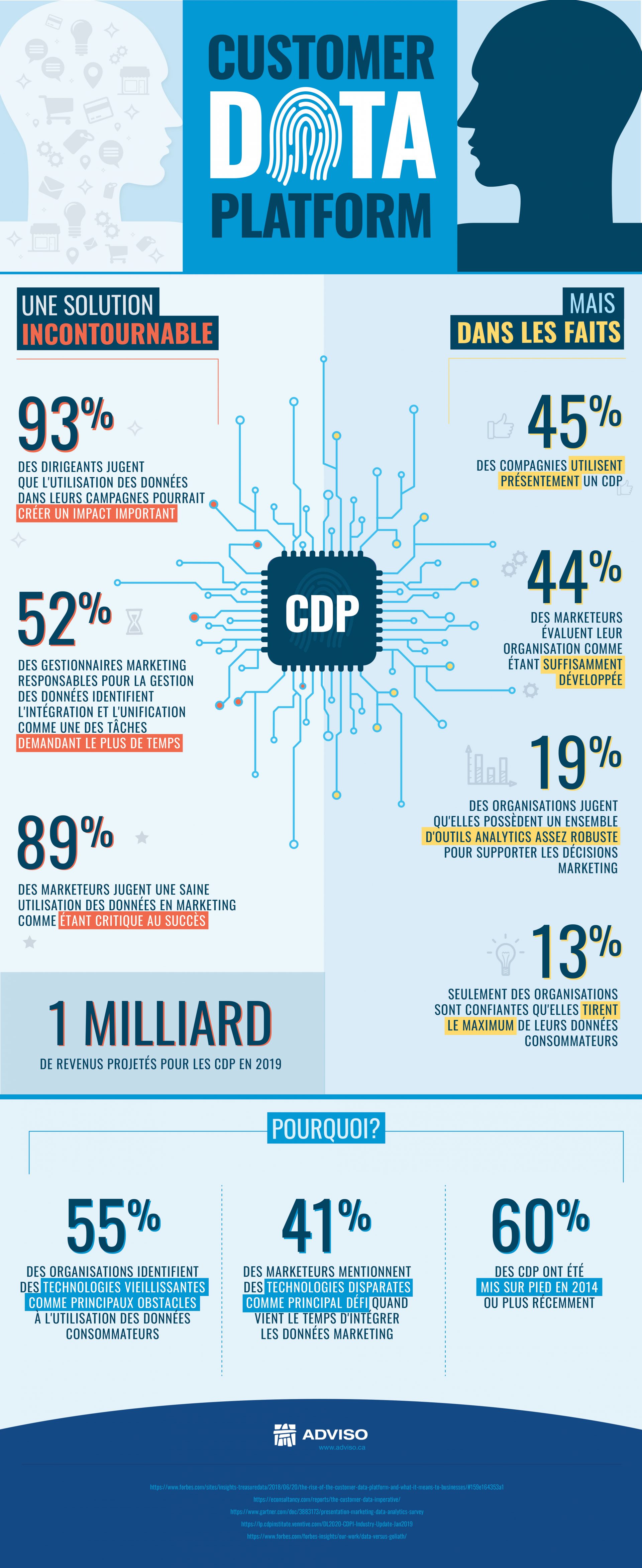 L’infographie qui suit rassemble des statistiques de différentes sources pour dresser un portrait de la réalité des marketeurs et de leur utilisation des CDP en 2019.