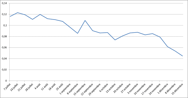 Alors qu’au mois de juillet, les pages rejoignaient de façon organique entre 11 % et 12 % des abonnés, ce pourcentage tombe à 5 % en décembre, une baisse de plus de 50 %.