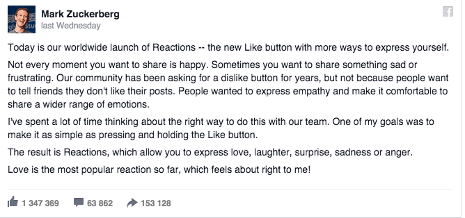 Selon Socialbakers, en 2015, 59% des marques utilisaient des emojis dans leurs messages Twitter et 40% dans leurs post Facebook. Il y a quelques semaines, Facebook nous a donc enfin proposé la possibilité de réagir différemment au contenu.