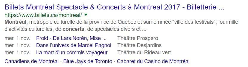 Agrégation du nombre d’avis, de la date, du nom de l’événement et du lieu. Google peut aussi afficher des sitelinks, comme c’est le cas ici.