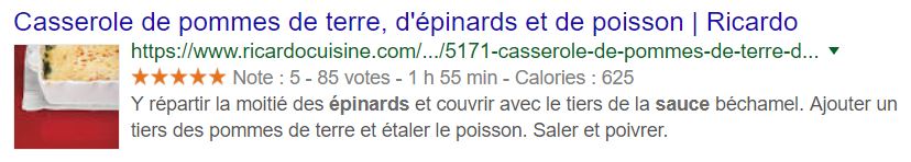 Un rich snippet est un résultat de recherche bonifié par des informations supplémentaires en plus du titre, de l’URL et de la meta description. Il en existe plusieurs types, vous trouverez les utilisations les plus populaires ci-dessous. Les informations supplémentaires présentent dans le résultat de recherche varient selon le type de contenu et sont récupérées via les données structurées, dont il existe également plusieurs formats (JSON-LD, Microdata, RDFa). Pour plus de détails techniques, vous pouvez vous tourner vers le support de Google, uniquement en anglais.
