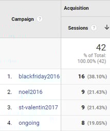 - Le filtre sur la variable de nom de campagne (utm_campaign) permet en principe de ne garder que les sessions correctement marquées avec des variables de campagne. Par contre, si certains de vos marquage utm ne comportent pas de variable de nom de campagne, elles seront exclue par ce filtre. En cas de doute, enlevez le filtre pour vérifier ce point.