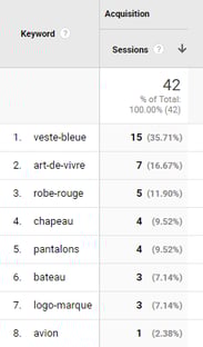 Avec cette nomenclature, chacun des éléments est ainsi facilement trouvable et analysable par la suite. Notez ici que les 42 sessions totales sont retrouvées, peu importe la dimension utilisée. Vérifier que ce chiffre est égal entre chaque dimension permet de s’assurer qu’on regarde toujours les mêmes données mais avec un angle différent pour chaque dimension.