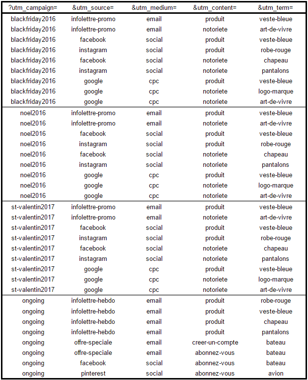 En structurant chacun de ces paramètres dans des utm spécifiques, on obtient une nomenclature de tagging qui ressemble à cela :