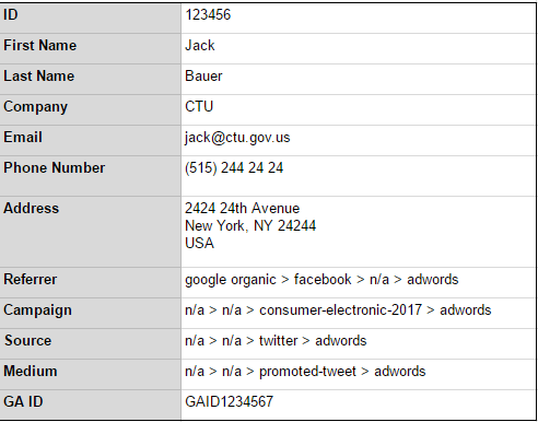 Notez que les champs Source, Média et Campagne ci-dessus seront remplis seulement lorsque le « c » (campagne), le « m » (média) et le « s » (source) sont présents dans le cookie _reff ou lorsque l’URL de la page de destination est marquée avec des paramètres UTM. Vous pouvez demander à votre développeur de laisser ces 3 champs vides ou d’y indiquer « N/A » dans votre CRM pour les utilisateurs qui n’atteignent pas le site via des URL marquées par des UTM.