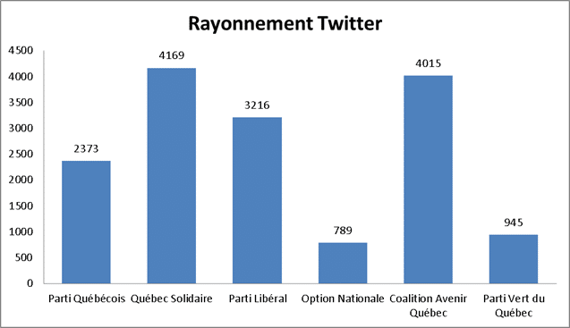 Si l’on regarde les comptes Twitter des partis qui se présentent aux élections québécoises 2014, celui comptant le plus d’abonnés est le Parti Québécois avec 34 600 abonnés au 23 mars 2014.