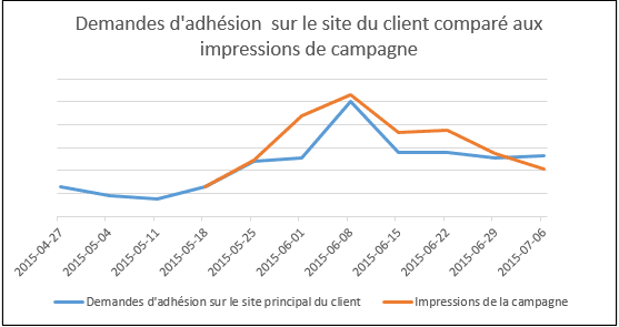 L’objectif de notre campagne était de maximiser l’adhésion à un produit. Tout notre média menait à une page d’atterrissage sur un micro-site, mais l’adhésion au produit pouvait également se faire à partir du site principal du client. Dû aux limites du site web avec lequel nous travaillions, nous avions uniquement une conversion « soft » qui consistait en l’ouverture d’un formulaire. Cette campagne a fait exploser les conversions sur le site principal du client. Nous avons donc procédé à plusieurs analyses de corrélation pour trouver la cause de l’augmentation des conversions. La somme de nos impressions de campagne a été identifiée comme le facteur d’influence principal. Voici d’ailleurs la comparaison des données :