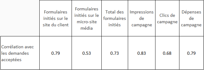 La plus forte corrélation trouvée fut entre le total des formulaires débutés (sur le site du client et sur le micro-site) et les demandes reçues. Cette corrélation de 0.87 était extrêmement forte, mais nous a peu surpris. On en retire surtout que la variation des formulaires initiés est cohérente avec celle des formulaires envoyés. On peut aussi conclure que les impressions, les clics et les dépenses de campagne n’étaient pas les facteurs d’influence principaux.