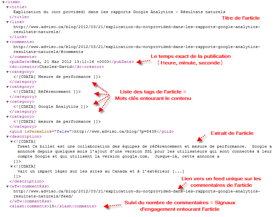 - Balise H1 (Titre de l’article): Balise qui n’est normalement pas utilisée pour générer le fragment d’une page dans les résultats de Google. Le flux RSS de ce site utilise la balise H1 comme titre de l’article.