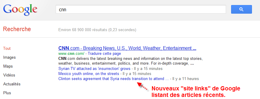 Depuis quelques mois, Google présente des nouveaux « site links » pour les sites de nouvelles importants. Il semblerait que les flux RSS influencent aussi ces nouveaux « site links ».