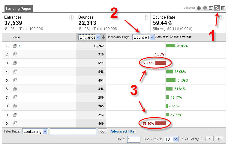 Lorsque vous allez voir dans Google Analytics le top des landings pages de votre site, vous pouvez passer dans la vue « comparaison » et sélectionner l’affichage du taux de rebond des pages. Lorsque vous avez fait cela, vous pourrez voir les pages qui ont le taux de rebond le plus haut (celles qui ont une barre rouge). Si nous traduisons ça en français, cela nous indique les pages recevant le plus de visiteurs entrants qui quitte le site directement après leur visite sur ces pages. Ainsi, il est clair que les utilisateurs n’ont pas été satisfaits dans leur attente par la réponse que vous leur proposiez. Cela peut provenir d’une annonce adwords ou d’une bannière qui créée une attente trop grande chez l’utilisateur en comparaison à la landing page de l’annonce, d’une navigation trop complexe qui effraye l’utilisateur ou d’un manque d’appel à l’action fort pour conserver l’utilisateur dans le site et le faire naviguer vers les éléments qu’il recherche.