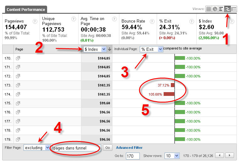 Pour cela, vous devez aller dans le rapport des Top content et trier ceux-ci par la métrique $ index. Afin de ne pas s’occuper des pages de l’entonnoir de conversion, il vous faudra exclure ces pages en utilisant le filtre dans le bas de la page. Ensuite, vous allez passer à la vue « comparaison » et vous comparerez les taux de sortie les plus importants. Ce sont ces pages-là qu’il faudra optimiser!