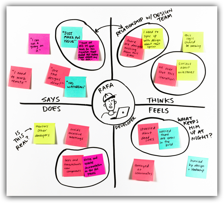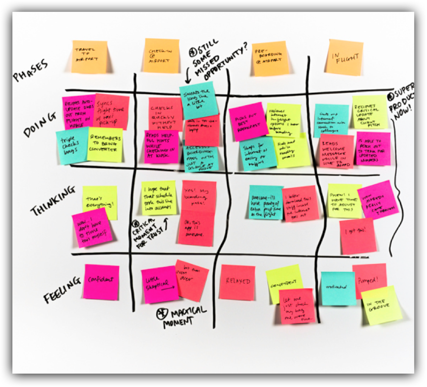 La réponse à ces questions se trouve d’abord au sein des données, études de marché et tendances auxquelles on a accès. Ensuite, elle se trouve grâce à des travaux de recherche de type sondage, entrevue, focus group, observation, etc. Les résultats permettent d’identifier des opportunités et de prioriser les idées et actions futures (carte d’empathie, scénario actuel et futur, etc.).