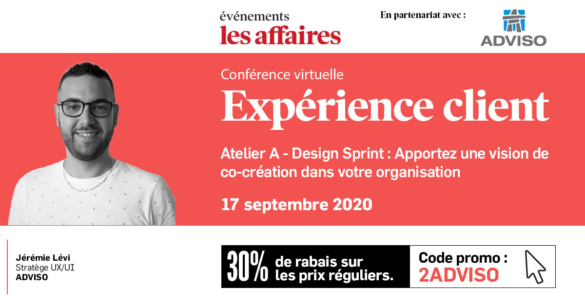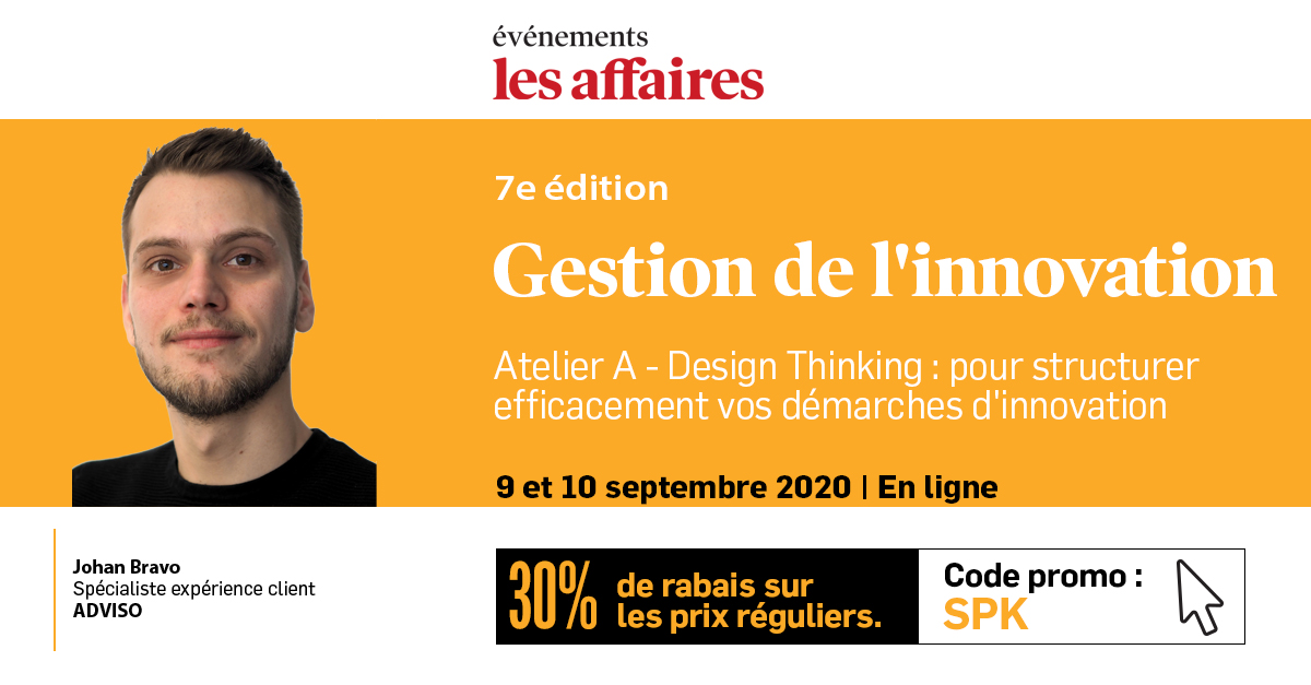 Pour en savoir plus sur le Design Thinking et son application, nous vous invitons à participer à deux ateliers que nous donnerons conjointement avec Les Affaires les 10 et 17 septembre prochain, à la conférence Gestion de l’Innovation et à la conférence Expérience Client.