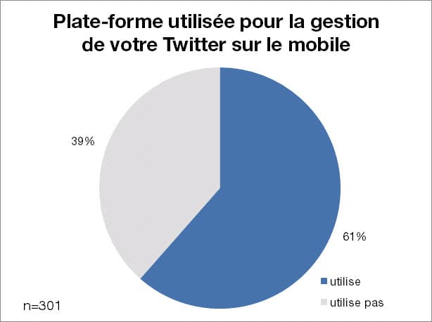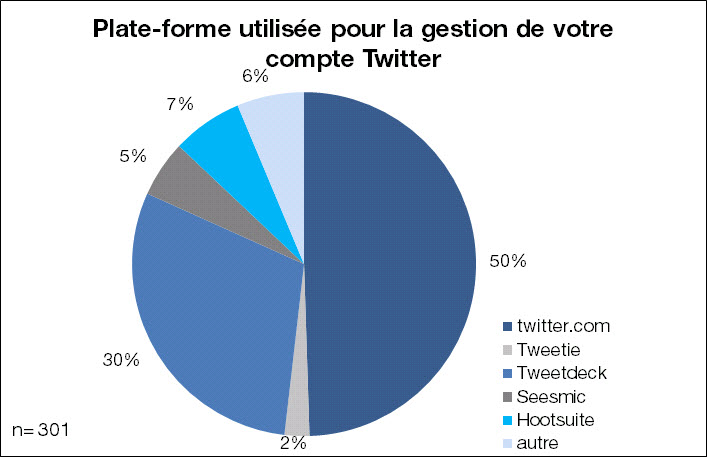 Selon les répondants, le site de Twitter est étonnamment la principale plate-forme utilisée par ses membres (50%) suivi de l’application Tweetdeck avec 30%. Originellement, les plate-formes ont été créées pour palier certaines lacunes de Twitter comme la gestion multi-comptes ou bien la disposition de l’information. Une refonte majeure de l’ergonomie de Twitter cumulée à l’ajout de services comme la gestion de compte, les statistiques et l’intégration de services connexes lui permettra de rapatrier les utilisateurs de plateforme et ainsi de monétiser de quelconque façon son offre.