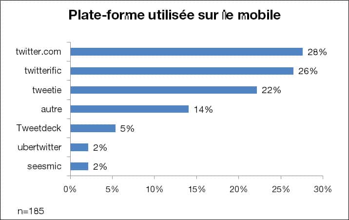L’utilisation de Twitter est intimement associée au mobile mais, paradoxalement, 61% des répondants n’utilisent pas Twitter sur leur mobile. Des 49% utilisateurs sur leur mobile utilisent majoritairement Twitter et son application Tweetie (acquise dernièrement) (50%) suivi de Twitterific avec 26%.