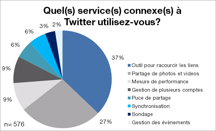Les services connexes les plus utilisés par les répondants sont les outils pour raccourcir les liens (bit.ly, tinyurl.com) avec 37% et les outils de partage de photos et vidéos (Twitpic, Twitvid) avec 27%. Par contre, le taux d’utilisation des autres types d’outils chute drastiquement et oscille entre 2% et 9%. Considérant que Twitter pourrait se doter de son propre service pour raccourcir les liens, on pourrait voir apparaitre un service complet de mesure de performance d’un compte et la pertinence de ses contributions.