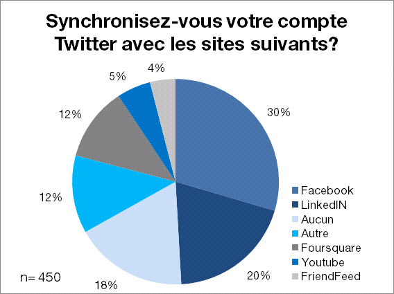 Près du tiers des répondants synchronisent leur compte Twitter à leur compte Facebook (30%) suivi de leur compte LinkedIN (20%). La synchronisation abusive sans personnalisation est de moins en moins utilisée par les membres – même si seulement 18% des répondants ne synchronisent pas leur compte – tellement que le réseaux sociaux offrent la possibilité de choisir quel statut synchroniser à l’aide d’un hashtag précis, comme par exemple Facebook (#fb) et LinkedIN (#in).
