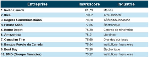 Les résultats de cet outil de gradation des entreprises sur le Web ne sont malheureusement pas disponibles pour chacune des catégories, mais le classement final a pu être visualisé. On peut y trouver au top des entreprises Radio-Canada, Ikea et Rogers Communications alors qu’à la fin du classement des entreprises comme BMR, Nolitours ou Réno-Dépôt y prennent place. Certains résultats se révèle être moins étonnants que d’autres, caril le Web ne doit pas être la première priorité des centres de rénovation versus des détaillants en ligne! Pour voir le classement final.
