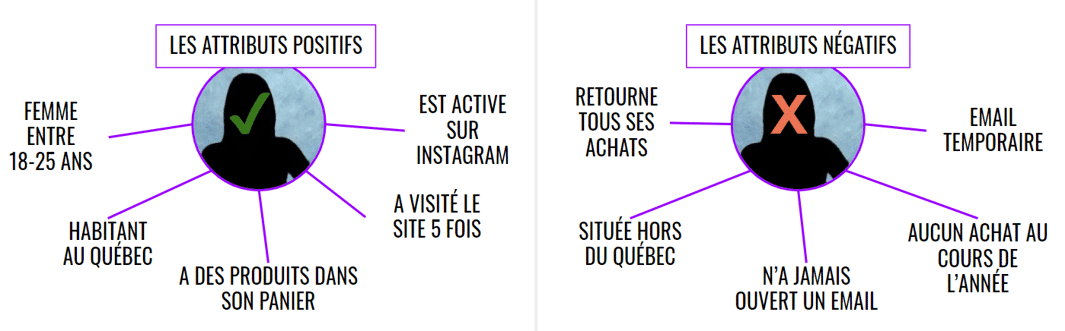 Il se pourrait, par exemple, que les caractéristiques de base soient réunies (âge, emplacement géographique, etc.), mais que l’intérêt soit faible en termes de visites sur votre site, d’interactions avec vos réseaux sociaux, de téléchargements ou autres. D’où l’importance de qualifier davantage et de segmenter vos contacts à l’aide de listes automatisées et d’un modèle de pointage comportant des attributs positifs et négatifs selon les données que vous avez recueillies de façon à prioriser vos contacts et vos efforts de marketing relationnel.
