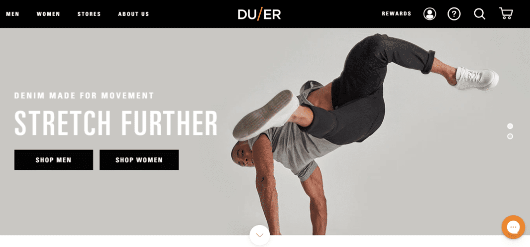 Votre image de marque doit refléter ce qui vous caractérise. Duer illustre très bien son identité sur sa page d’accueil, on comprend tout de suite que ses jeans sont conçus pour les gens actifs, tant par l’image que par son slogan : Denim made for movement.