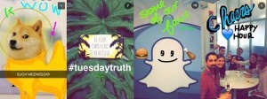 Selon l’emplacement où l’on Snap, il est possible d’ajouter un filtre sur notre photo/vidéo qui sera automatiquement ajouté à nos choix selon notre géolocalisation. Snachat invite d’ailleurs les artistes et designers à soumettre des idées de filtres pour représenter une ville ou un événement.