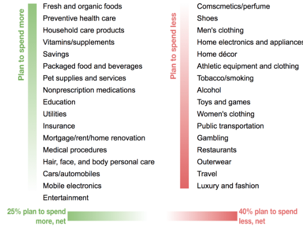 Une baisse de revenus engendre évidemment une repriorisation des besoins et des achats chez les consommateurs. Dans ce sens, le Boston Consulting Group a réalisé une analyse permettant d’identifier quels produits et services de consommation subiraient les plus gros impacts en raison de ces changements dans un horizon de 6 mois, d’ici à la fin août. Nous pouvons y voir un rebalancement des investissements vers de l’épargne, des produits de bien-être et un délaissement des voyages et des produits de luxe.