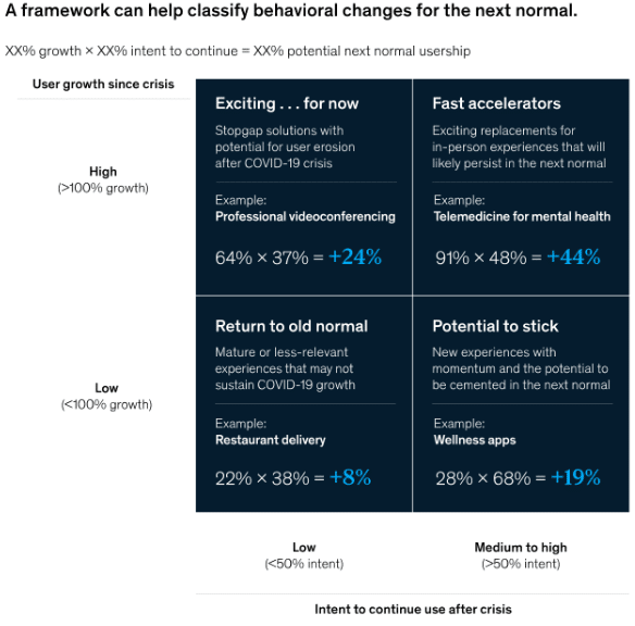 En piste de solution, le récent modèle de McKinsey sur les comportements des consommateurs dans le « nouveau normal » s’avère fort intéressant et permet de classer les comportements selon deux axes: