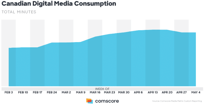 Un autre changement lié au confinement est la croissance considérable du temps passé en ligne; que cela soit pour visionner des séries, des documentaires, des nouvelles ou encore pour suivre un entraînement sportif. Avec les tendances de travail à distance qui semblent vouloir perdurer pour une certaine partie de la population et un risque de deuxième vague, il ne serait pas surprenant que le temps passé en ligne reste élevé comme le laisse entrevoir l’étude ComScore ci-dessous.