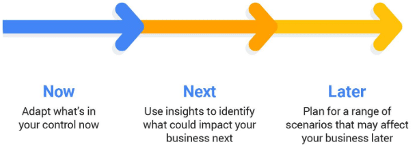 Afin de répondre à cette question, les équipes de Google Canada encouragent l’utilisation du modèle Now, Next, Later, un outil de planification utilisé dans de nombreux secteurs afin d’évaluer et adapter les stratégies marketing. Il permet de déterminer les mesures à prendre maintenant, les points sur lesquels se concentrer au cours des prochains mois et les points sur lesquels se concentrer à long terme.
