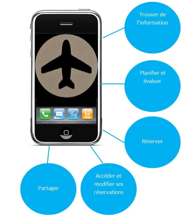 De plus, le mobile peut être utilisé à toutes les phases de la planification du voyage en ligne : avant, pendant et après le voyage. Selon une étude réalisée par Ness, les tâches les plus convoitées par les voyageurs qui utilisent leurs mobiles sont : voir une carte et obtenir les directions pour se rendre à un endroit (35%), trouver des activités à proximité (restaurants ou spectacles par exemple – 28%), chercher des produits tels qu’une chambre d’hôtel ou un vol (25%), effectuer un achat en ligne (21%), effectuer son checkin pour un avion, hôtel ou train (20%), réserver un hébergement (19%), faire des modifications aux réservations effectuées (17%) et utiliser le mobile comme boarding pass pour un vol ou train (16%).