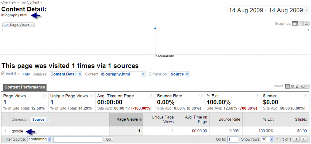 Alors là, ça devient vraiment obscure cette histoire. Et les pages alors ? A quelle source sont-elles liées ? Pour le savoir, je suis rentré dans les détails de la page « /biography.html », que j’ai vue en venant de Google, et j’ai segmenté par source.