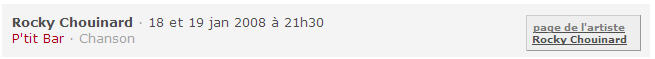 Ces choix ont apparemment été effectués pour permettre l’ajout d’une boite supplémentaire à droite de chaque résultat (ci-dessous). Cette boite contient un lien vers la page de l’article et lorsque c’est disponible une photo. Le but de ce lien est apparemment d’orienter les utilisateurs vers une section nécessitant une inscription. Ceci me parait très superflu, d’une part car cela est peu utile pour des utilisateurs dont le but est de trouver un artiste qu’ils connaissent déjà et d’autre part car la présence d’une photo alourdi encore la présentation des spectacles. De plus les utilisateurs ne sont pas incités à s’inscrire car on ne leur en présente jamais les avantages potentiels.