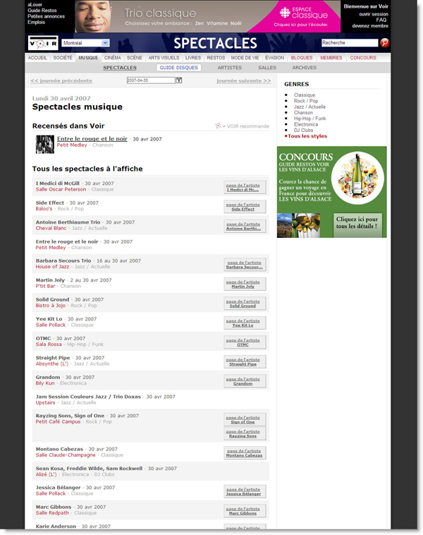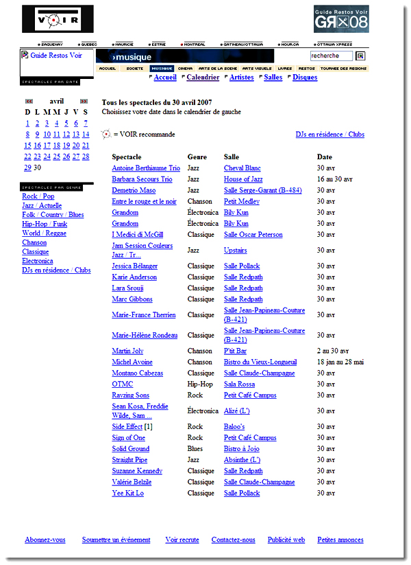 Ancienne interface de la liste des concerts de www.voir.ca