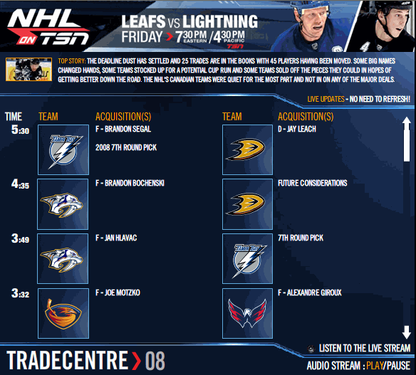 Ce n’est comme si les TSN et RDS de ce monde n’attendaient pas le trafic. Nous avons vu ces grands réseaux rivaliser d’originalité pour vous servir le dernier échange en temps réel. En plus de diffusé Bob Mackenzie, cellulaire à la main, prenant note de la dernière rumeur pendant toute la journée à l’émission « Trade center 2008» (qui a commencé à 8h du matin!), TSN a aussi triomphé sur Internet. On se souviendra du « trade tracker » en flash qui mettait à jour les transactions sans « refresh », de sa diffusion en direct de son émission télévisé (à quand les matchs d’hockey en direct sur Internet?) et de ses alertes pour cellulaires! RDS et TSN nous ont tous deux servis une « splash page » spéciale pour diriger le trafic directement sur leur section dédiée à la date limite des échanges.