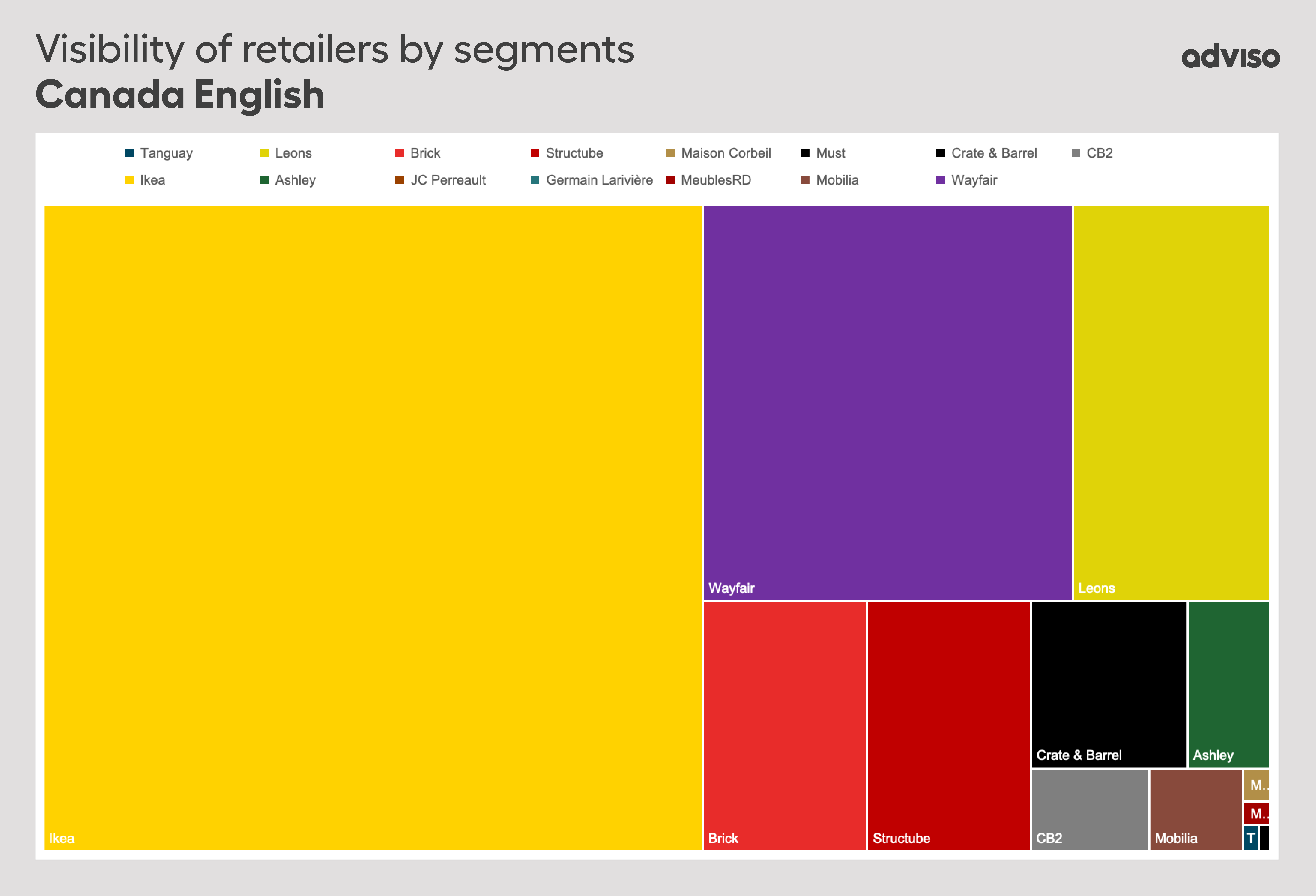 For searches in French, IKEA is by far the most successful and undoubtedly plays a significant role in the furniture purchasing journey for consumers. Among Quebec-based companies, Tanguay and Structube compete for the second position. Several Canadian retailers have no visibility in French.