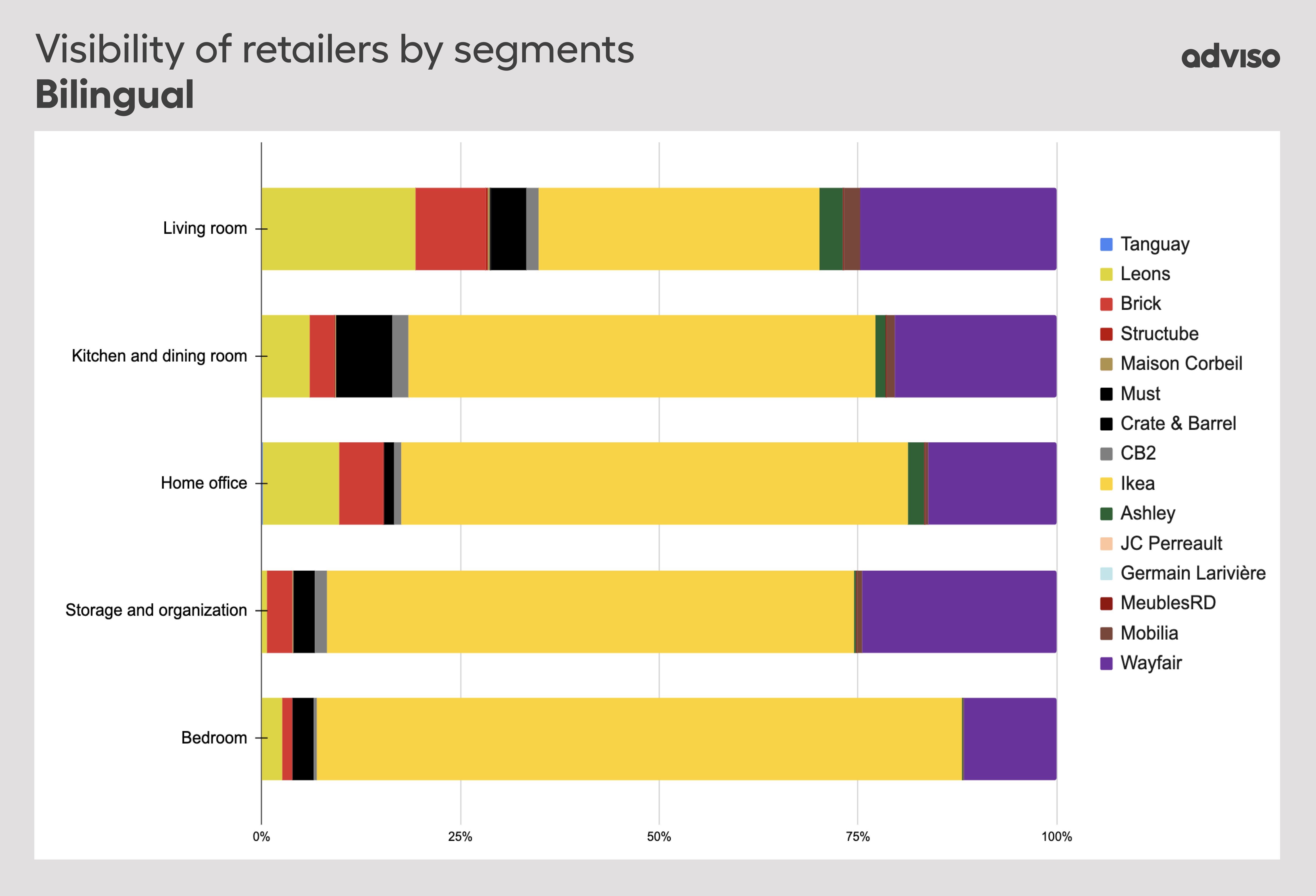 In conclusion, major international furniture retailers such as IKEA and Wayfair dominate the Anglophone market compared to Canadian retailers. In the Francophone market, some Quebec-based furniture retailers gain a significant share of traffic and visibility, but IKEA remains the undisputed leader.