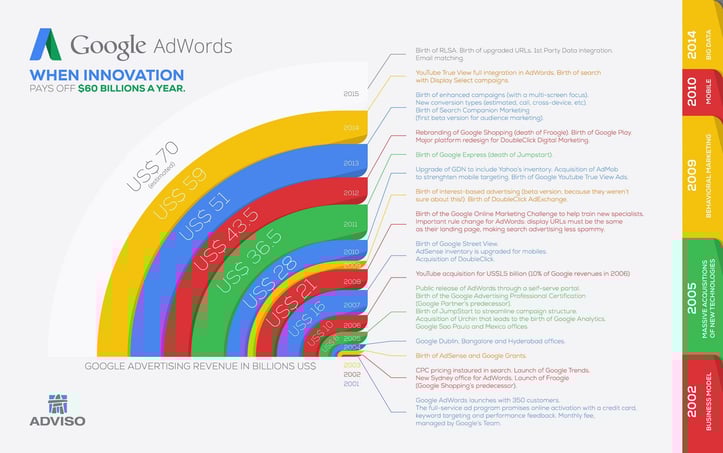 Today, October 23 2015 marks the 15th anniversary of Google AdWords, Google’s index monetization platform. Fifteen years after the creation of this index that makes finding websites quick, Google now reports $60 billions in revenue annually.