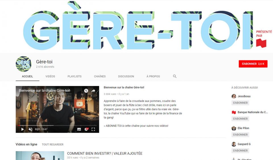 Au Québec, la Banque Nationale a, quant à elle, décidé de faire appel au YouTuber Émile Roy pour intéresser la génération Z aux finances personnelles. La chaîne YouTube Gère-toi, créée par et pour les jeunes, propose du contenu ludique, informatif et surtout différent de ce qu’ils ont l’habitude de consommer provenant de l’industrie financière.