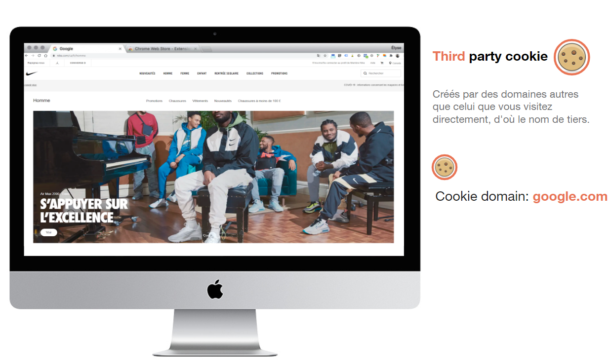 When the same user A goes to Nike.com, a third-party cookie is stored under the third-party domain name for advertising purposes: “Cookie domain: google.com.”