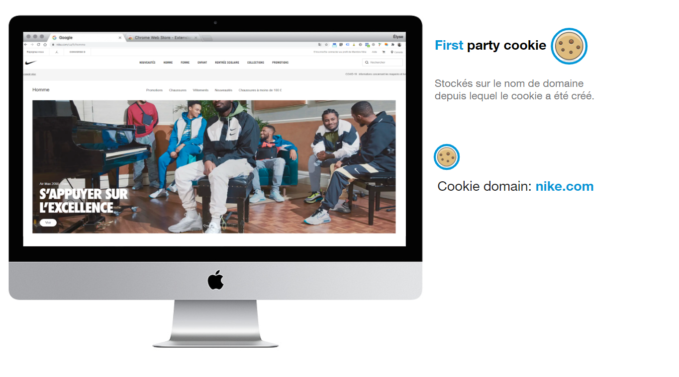 User A visits Nike.com. A first-party cookie is stored under the domain name where the cookie was created: “Cookie domain: nike.com.”