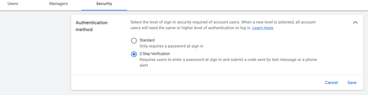 - Is two-factor authentication activated for users with a Standard or Admin access level?