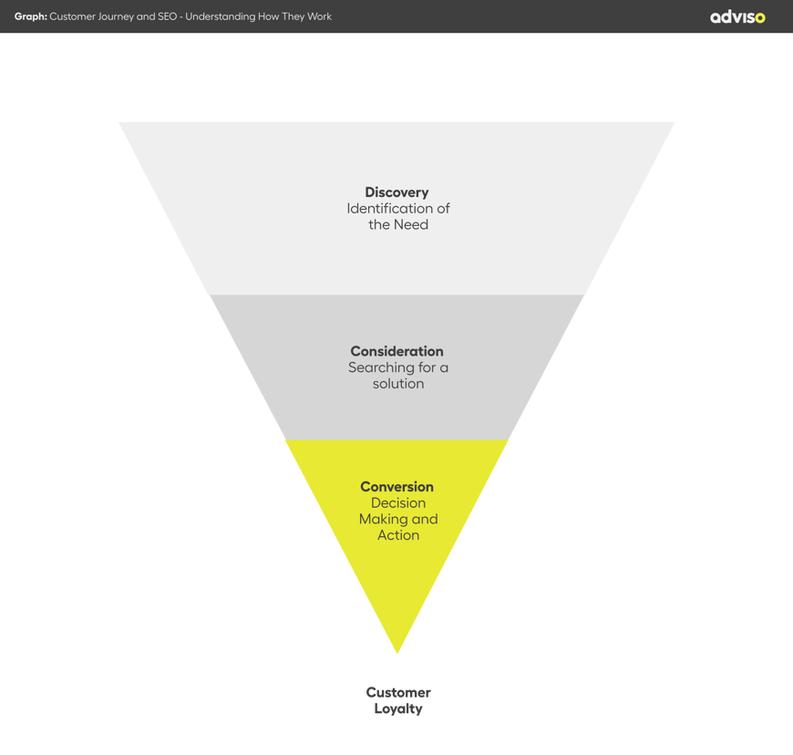 After identifying their need, the user conducts specific searches for a product or service, indicating progress in the conversion journey, and we aim to guide them towards the best solution.