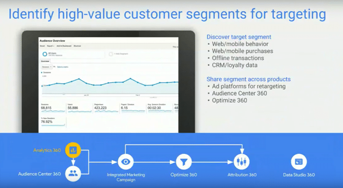 Basically, this is a tool to slice and dice data from all touch-points for exploratory analysis. Google Analytics 360 is the place where you’ll get a full view of your consumer insights and where segmentation becomes really powerful. The product is ideal for first-party data integration like offline sales, offline advertising (like TV ads), web traffic, mobile app activity and CRM customer attribute data (but without PII – Personally Identifiable Information).