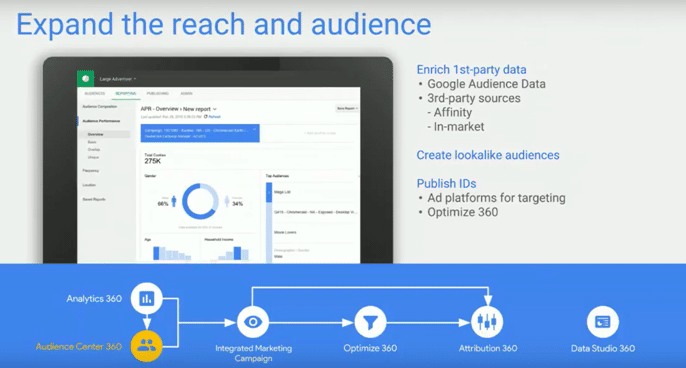 Audience 360 is a Data Management Platform (DMP) that helps you understand your customers. It is designed to connect with other marketing delivery tools to deliver the right message to the right people more easily across all acquisition and engagement platforms (such as email marketing, automation, advertising and experimentation tools). It offers native integration with Google and DoubleClick tools, plus it’s open to third party data providers, Demand Side Platforms (DSP) and more.