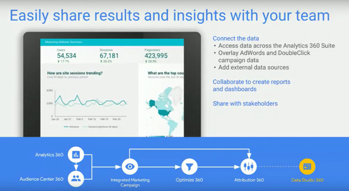 This is a collaborative data analysis and visualization tool based on Google Docs functionalities. It overlays data from Analytics, Adwords, DoubleClick, Google Sheets, BigQuery and external data sources. Data Studio 360 lets you create custom dashboards and reports with your team and share them with your stakeholders.
