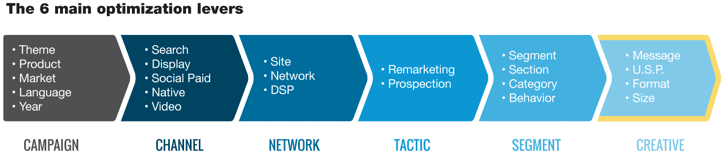 In any campaign, audiences are generally broken into multiple segments. To get good results, the creative needs to be different for each of the six levers. We are therefore talking about a significant quantity of creative. You then have to prepare a series of weekly hypotheses for each element. Essentially, if you follow the diagram above, you’ll see that it will roughly take 18 weeks to optimize your creative.