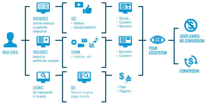 For example, right now, you are probably trying to understand what a CMP is. Let’s agree that you are closer to a conversion point than if you were scrolling through your news feed in a meeting that was running long. Using this model from 2008, the goal was always to drive back to the ecosystem, and a final binary ending: conversion or no conversion. It was a simpler time… Budgets were primarily invested in the bottom of the funnel, as close to the point of conversion as possible, then the middle, then finally, if there was budget left over, the top. Brand image was also far less important in digital because it simply made more sense to put your money on measurable conversions.